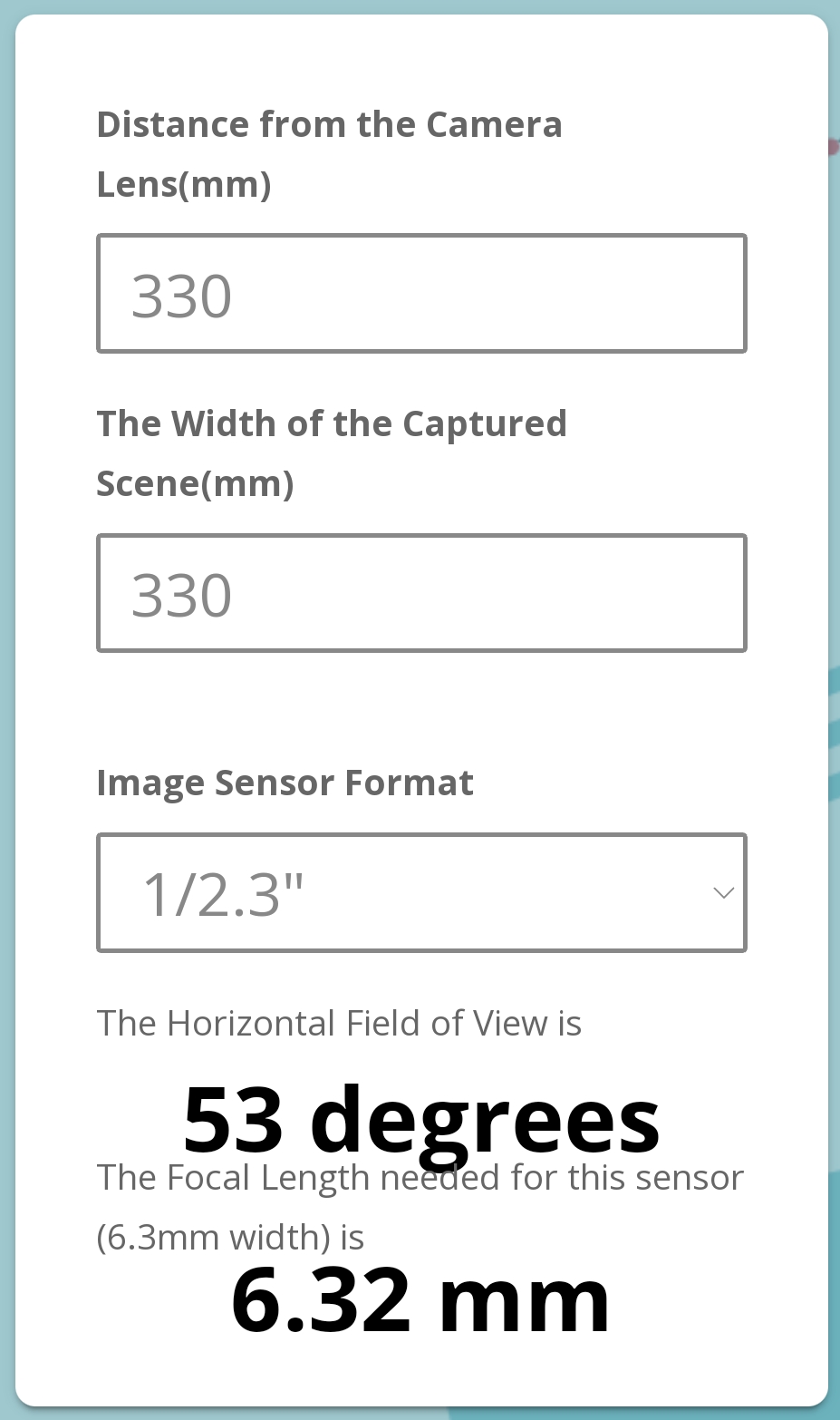 Focal length calculator for a 13” field of view from same distance away: